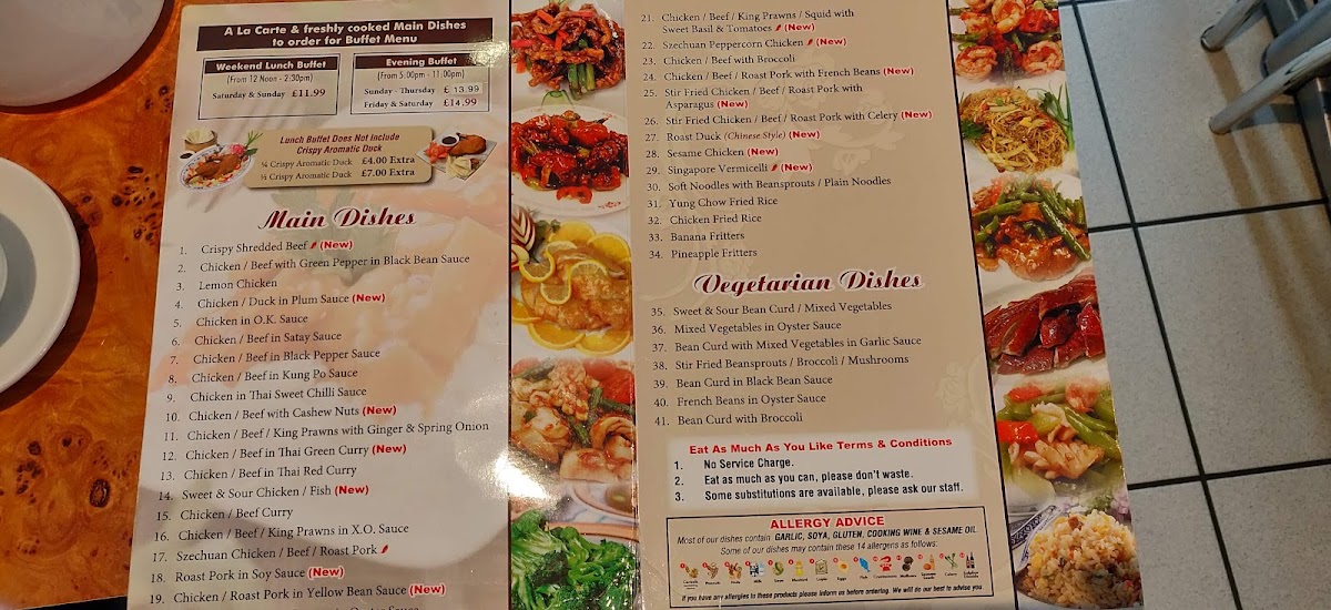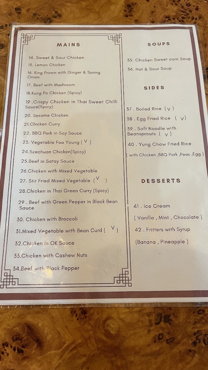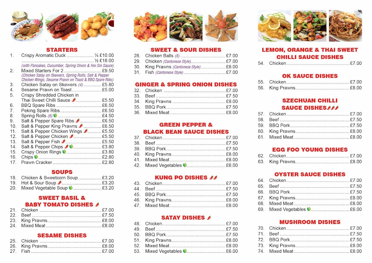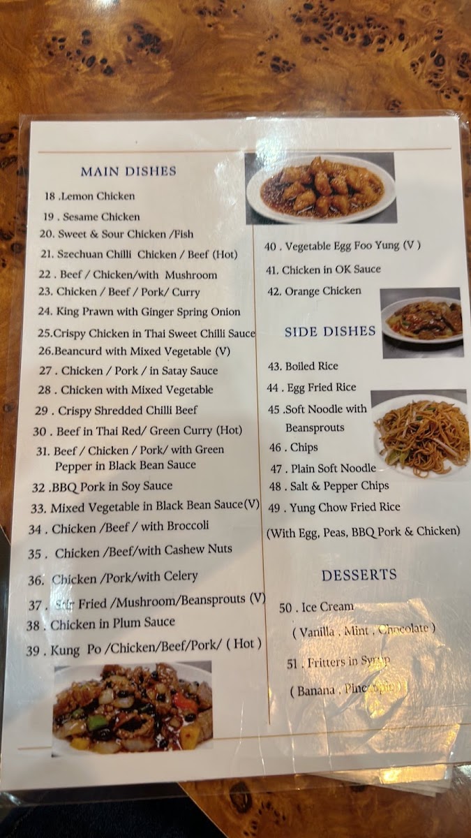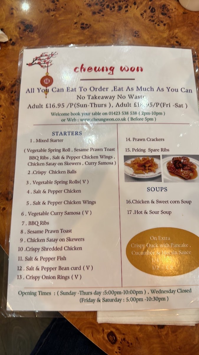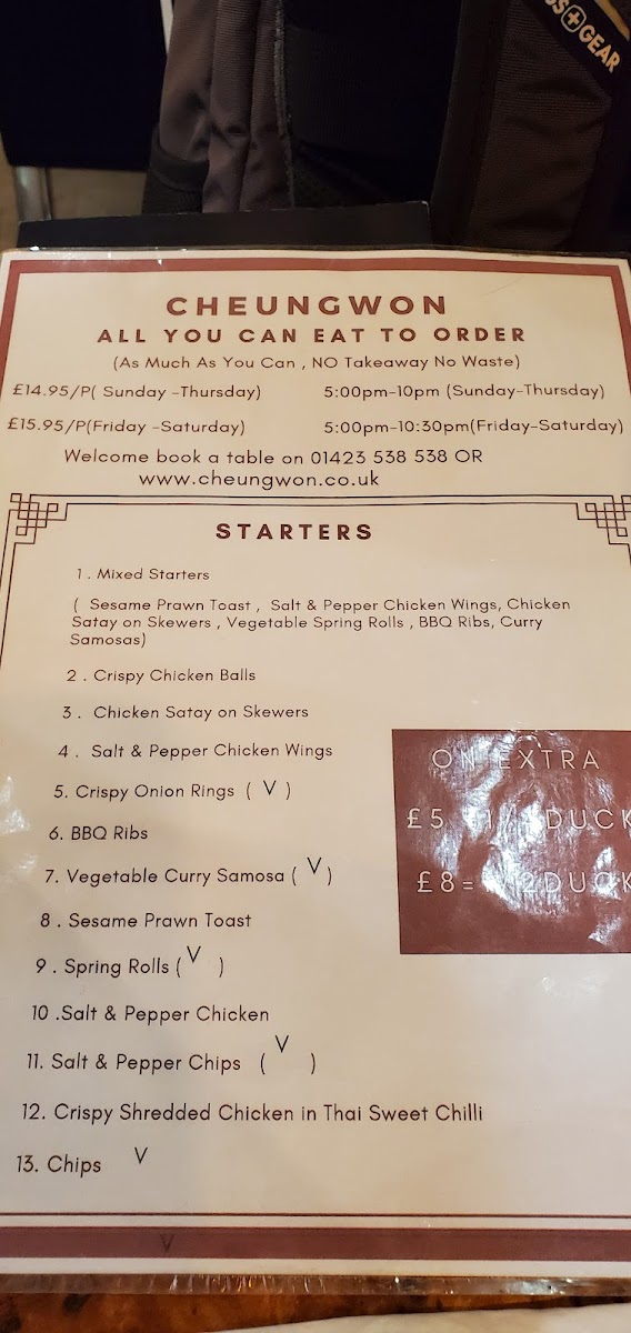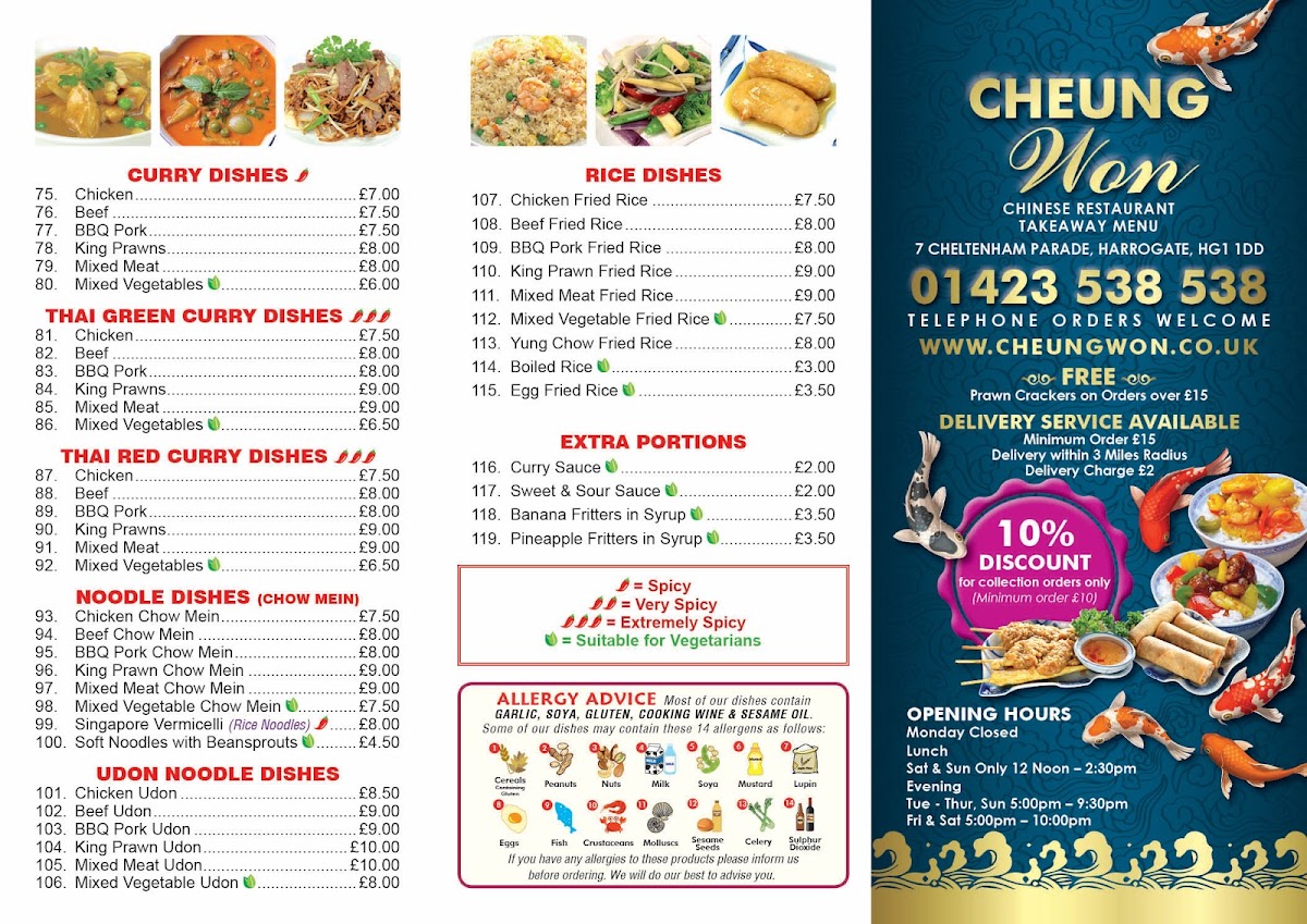 As a reviewer looking back at the menu of Cheungwon Harrogate, I find it to be a comprehensive showcase of classic Chinese and Thai-inspired cuisine, carefully structured to suit a wide range of tastes. The journey often begins with starters such as Crispy Aromatic Duck, Mixed Starters For 2, Sesame Prawn On Toast, Crispy Shredded Chicken, and BBQ Spare Ribs, which set a satisfying and indulgent tone. The soup selection, including Chicken & Sweetcorn Soup, Hot & Sour Soup, and Mixed Vegetable Soup, offers comforting and familiar flavours. Moving into the main courses, the menu impresses with its depth: nutty and fragrant options like Sesame Chicken, Sesame King Prawns, and Sesame Fish sit alongside ever-popular classics such as Sweet & Sour Chicken Balls, Sweet & Sour Chicken, King Prawns Sweet & Sour, and Sweet & Sour Fish. Aromatic wok dishes like Ginger & Spring Onion Chicken, Ginger & Spring Onion Beef, and Ginger & Spring Onion Mixed Meat highlight balance and freshness, while bolder flavours shine through the Green Pepper & Black Bean Sauce range and spicy favourites such as Kung Pao Chicken, Kung Pao King Prawns, and Kung Pao Mixed Meat. For those who enjoy richer sauces, the menu continues with Chicken Satay, Mixed Meat Satay, Chicken In Ok Sauce, and King Prawns In Ok Sauce, as well as the fiery Szechuan selections. The variety extends further with comforting omelette-style dishes like Chicken Egg Foo Young and Mixed Meat Egg Foo Young, savoury Oyster Sauce dishes, earthy Mushroom options, and warming Curry, Thai Green Curry, and Thai Red Curry dishes. To complete the experience, staple Chicken Chow Mein, Mixed Meat Chow Mein, Chicken Fried Rice, and Mixed Meat Fried Rice ensure a filling meal, while extras such as Curry Sauce, Sweet & Sour Sauce, Banana Fritters In Syrup, and Pineapple Fritters In Syrup add flexibility. Overall, the menu reflects consistency, variety, and a clear respect for well-loved flavours, making Cheungwon Harrogate a reliable choice for both casual dining and satisfying takeaways.